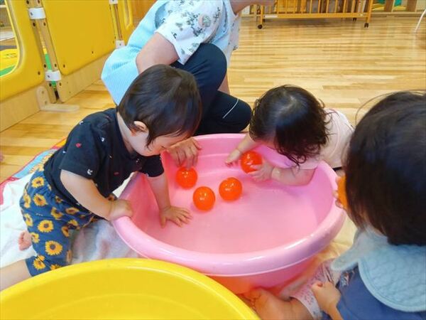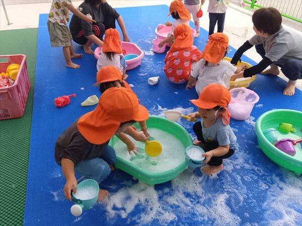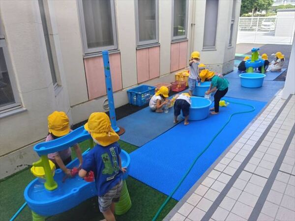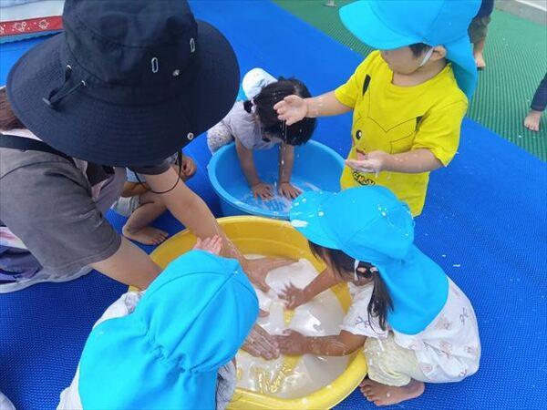 真夏日が続いた今夏でしたが、園舎横のスペースは風が通り、まるで軽井沢かのような心地よい場所で水遊びを存分に楽しみました。ミストシャワーを浴びながらオモチャを使って水をかけあったり、色水や泡、氷、片栗粉、寒天を使い年齢に合わせた遊びを工夫しながら感触遊びを楽しんでいた子ども達でした♪