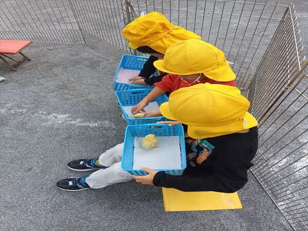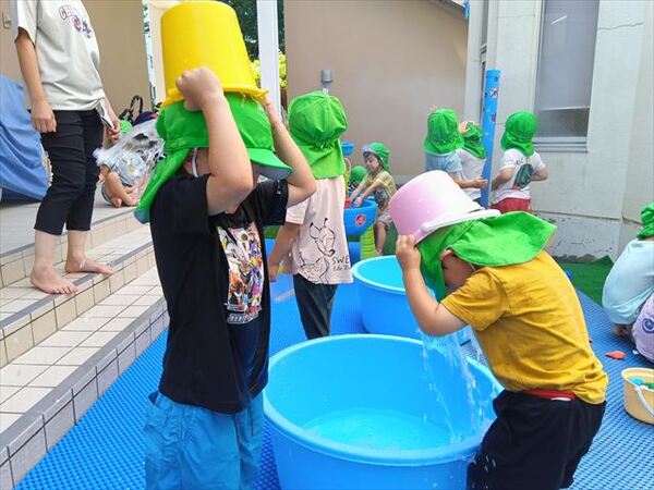 真夏日が続いた今夏でしたが、園舎横のスペースは風が通り、まるで軽井沢かのような心地よい場所で水遊びを存分に楽しみました。ミストシャワーを浴びながらオモチャを使って水をかけあったり、色水や泡、氷、片栗粉、寒天を使い年齢に合わせた遊びを工夫しながら感触遊びを楽しんでいた子ども達でした♪