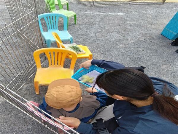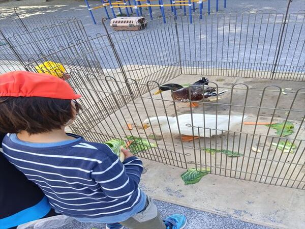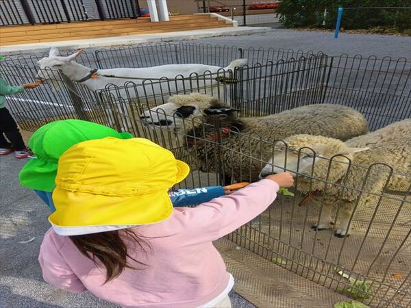 福田牧場から、ひよこ、モルモット、あひる、チャボ、やぎ、羊が遊びに来てくれました。準備の際に、朝からコケコッコーと元気に鳴く声が聞こえてビックリする子もいましたが、園庭が動物園になっていく様子を見ながらワクワクする子ども達。触れ合いコーナーでは、ひよこやモルモットを膝に乗せてもらい、体を撫でてあげ、キャベツやニンジンの餌あげでは、首を長く伸ばすヤギに初めは腰がひけていましたが、飼育員の方に餌のあげ方を教えてもらい、上手にあげられるようになりました。