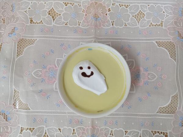おやつは、クリームおばけが飛んでいるカボチャのプリンでした。